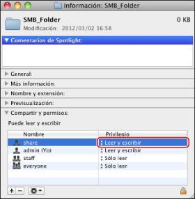 Para los datos de la carpeta, marque [Permitir] tanto para [Escritura] como para [Lectura], o bien mayores derechos de acceso.