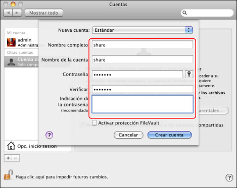 Establezca el usuario y la contraseña para acceder a la carpeta compartida.