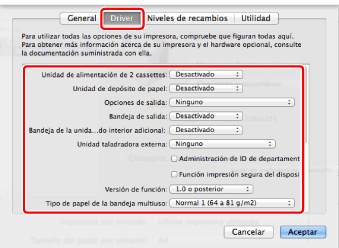 Asegúrese de seleccionar únicamente aquellas opciones que realmente estén instaladas en la impresora.