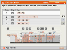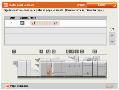 Si se produce un atasco de papel y la impresión se detiene cuando esté imprimiendo en el modo Grapar, no quite el papel de las áreas excepto las mostradas como posibles de atasco de papel en la pantalla táctil. Por ejemplo, si el papel se atasca en la unidad principal, no quite las hojas depositadas en la unidad de acabado que no tiene atasco de papel. (La impresión y el grapado se reanudarán después de haber eliminado el atasco de papel de la unidad principal.)