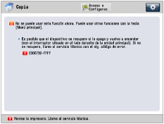 Para conocer las instrucciones acerca de cómo reiniciar el equipo (poner el interruptor de alimentación principal en la posición OFF, y después en ON), consulte "Alimentación principal y tecla de ahorro de energía".