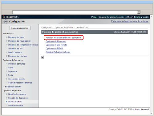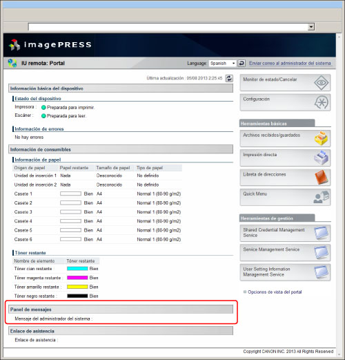 Si selecciona [Mostrar en el portal], el panel de mensajes se muestra en la página del portal de la IU remota.