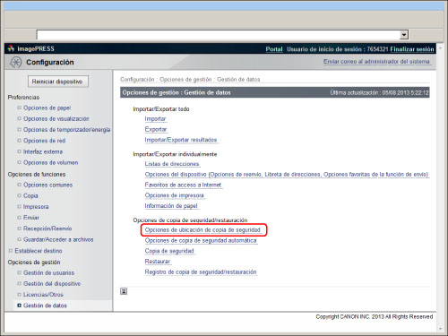 Si desea ver el registro de copia de seguridad/restauración, haga clic en [Configuración] → [Gestión de datos] → [Registro de copia de seguridad/restauración].