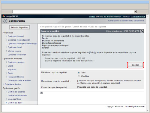 Si desea programar una copia de seguridad, haga clic en [Configuración] → [Gestión de datos] → [Opciones de copia de seguridad automática]. Seleccione [Copia de seguridad total] o [Copia de seguridad de cambios] y [Todos los días] o [Especificar días] → introduzca el momento en el que quiere hacer la copia de seguridad.