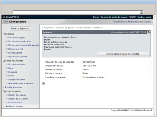Si hace una copia de seguridad o restauración de los datos almacenados sin reiniciar el equipo después e cambiar el idioma de la pantalla táctil pulsando [Preferencias] (Configuración) desde el panel de control del equipo, los datos es posible que no se haga correctamente la copia de seguridad o restauración de los datos almacenados.