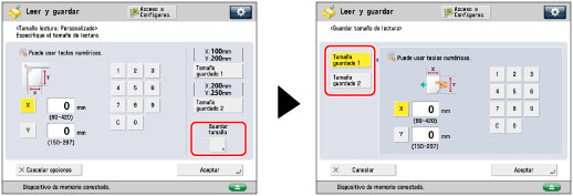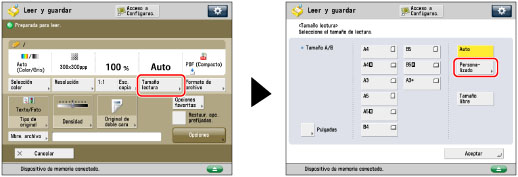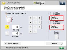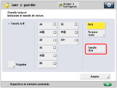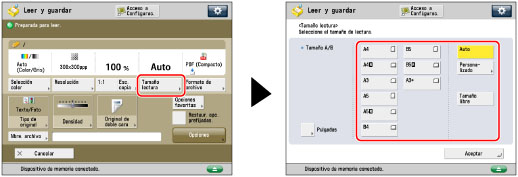 Puede especificar manualmente un tamaño de lectura al leer originales que no pueden detectarse con [Auto]. También puede guardar el tamaño de lectura especificado.