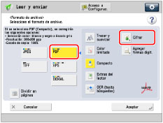 Puede almacenar las opciones para archivos PDF cifrados en sus Opciones favoritas. Si no desea establecer [Contraseña abrir docum.] y [Contraseña de permisos] y [Opciones favoritas], deje las contraseñas en blanco.