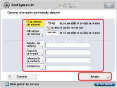 Pulse [Información de contacto] → introduzca la información de contacto para el administrador del sistema → pulse [Aceptar].