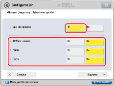 Pulse [Configuración opc. numerar juegos de copias] → [Sí] para <Opc. de números> → especifique cada opción.