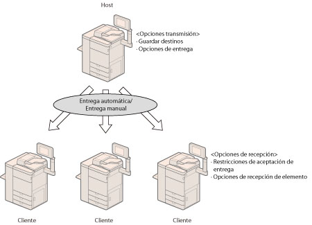 Si se ha desactivado [Restringir recepc. info. dispositivos] para <Opciones de recepción>, el equipo puede recibir la información de dispositivos entregada desde distintos modelos del equipo. (Consulte "Establecer el equipo receptor".) No obstante, es posible que alguna información no se entregue correctamente.