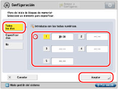 Si selecciona [Todos los días], seleccione un número ([1] a [5]) → introduzca la hora de inicio con