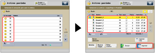 Puede configurar la pantalla [Archivos guardados] para imprimir.