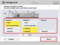 El orden de prioridad de los destinos de salida viene determinado por el orden de las bandejas de salida seleccionadas. La prioridad se muestra con "1" y "2".