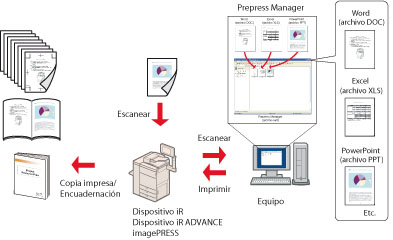 Prepress Manager es una aplicación de impresión. Una amplia gama de modos de imposición permiten crear, editar e imprimir varios documentos. Puede utilizar el modo de exportación para convertir los datos leídos en archivos PDF, JPEG, TIFF, o BMP. También puede editar y corregir la imagen leída utilizando el editor de imágenes instalado como estándar.
