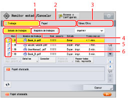 En la pantalla Estado de trabajos, podrá ver los trabajos actuales y los trabajos en espera. Pulsando los botones situados debajo de la lista, podrá cambiar el orden de los trabajos en espera, cancelar trabajos, y comprobar los detalles de los trabajos.
