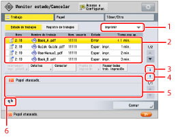 Los botones mostrados pueden diferir dependiendo del tipo de trabajo de operación. Para más información sobre los botones mostrados en la pantalla Estado de trabajos, consulte "Iconos de la pantalla Trabajo".