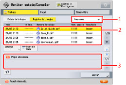 La pantalla Trabajo aparece cuando se selecciona [Trabajo] en la pantalla Monitor estado/Cancelar. La lista de trabajos se muestra en la parte superior, y la lista de mensajes para el estado actual del dispositivo se muestra en la parte inferior de la pantalla Trabajo. Pulse [Estado de trabajos] para ver los trabajos actuales y los trabajos en espera. Pulse [Registro de trabajos] para ver los trabajos completados.