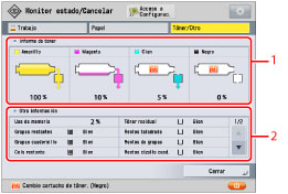 La información correspondiente a la cantidad de tóner restante se muestra en la parte superior, y otra información se muestra en la parte inferior de la pantalla Tóner/Otro.