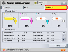 Compruebe las cantidades restantes de tóner y grapas, el porcentaje de utilización de la memoria, y la cantidad de tóner residual.