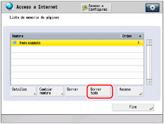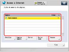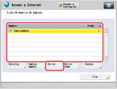 Seleccione [Nombre] u [Orden] para clasificar la lista de memorias de páginas en orden ascendente o descendente.