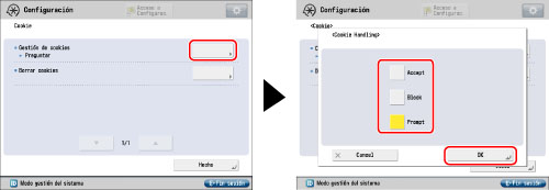 La opción prefijada para [Gestión de cookies] es 'Aceptar'.