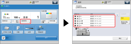 如果“设置/注册”的[功能设置]中设置了[基于色彩纸盒自动选择],根据复印时所选的色彩模式,可以执行自动纸张选择。(See "根据颜色指定纸盒自动选择.")