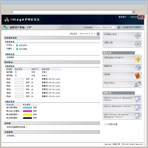 对于普通用户,“设置/注册”屏幕上的某些项目可能会受到限制。触摸面板显示屏幕上用户没有操作权限的项目变灰且无法选择。“远程用户界面”上不显示用户没有操作权限的项目。
