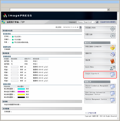 要从“远程用户界面”的门户页面登录,将“设置/注册”的[管理设置]中的[授权/其他]的[远程用户界面]设置为“打开”。(See "启动远程用户界面之前.")