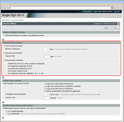 密码限制设置只有对在限制设置完成后注册/编辑的密码才生效。已注册的密码超出限制时,执行用户认证时会显示提示更改密码的屏幕。