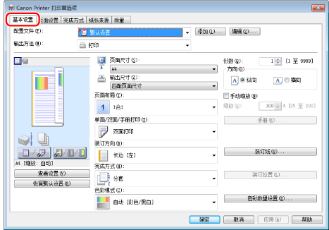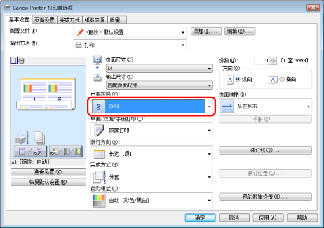 如果无法选择[页面布局]的选项,请显示[设备设置]选项卡,然后从[在主机后台打印]选择[自动]或[启用]。有关如何显示[设备设置]选项卡的说明,请参阅“设置打印机选项”。