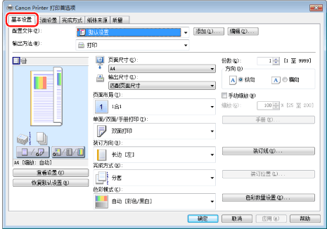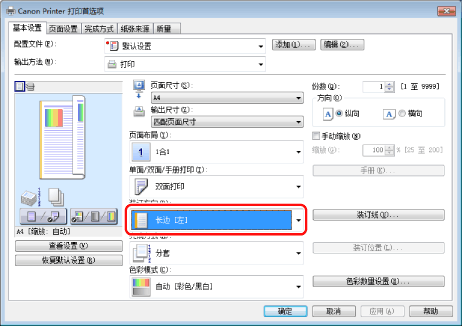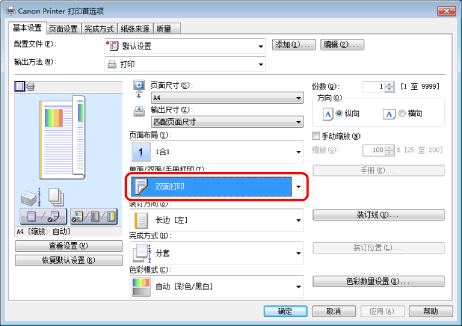 [单面/双面/手册打印]的默认设置为[双面打印]。还可以根据需要将默认设置更改为[单面打印]。有关更改默认设置的说明,请参阅“