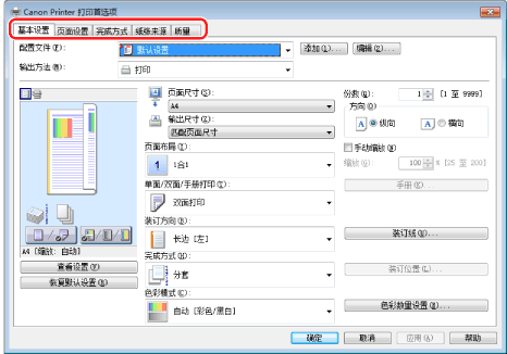 如果无法选择配置文件,在[控制面板]中显示打印机属性对话框,并单击[配置文件]选项卡,然后检查是否已选择[允许选择配置文件]和[允许编辑设置]。有关如何显示打印机属性对话框的说明,请参阅“