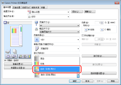 根据数据的类型,[自动[彩色/黑白]]自动在彩色打印和黑白打印之间切换。