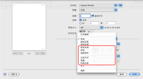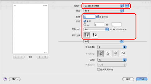 若未能在[打印]对话框的上部设置以上功能,可在[份数与页数]首选项窗格或[页面设置]对话框中显示和设置。