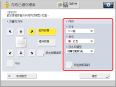 也可以選擇在[註冊頁碼編排/浮水印字元]中註冊的文字。(See "註冊/編輯/刪除頁碼和浮水印的使用者定義文字.")