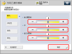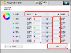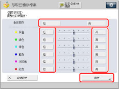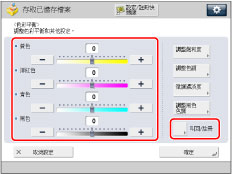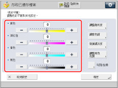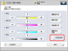 若使用「全彩」模式列印從原稿台玻璃/送稿機掃描的郵件信箱文件,可以在[全彩列印逼真化設定]中變更色調。(See "使用全彩列印創建更加鮮豔的色彩.")