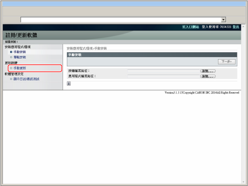 從「遠端使用者介面」的入口網站頁面,按一下[設定/註冊]→[授權/其他]→[註冊/更新軟體]。