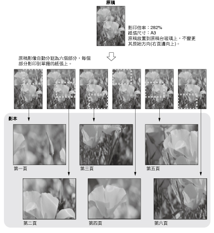 「海報」模式下影印的原稿影像重疊。透過粘貼重疊區域將相鄰頁合併。