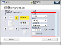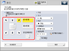 也可以調整日期的位置。(See "註冊/編輯/刪除頁碼和浮水印的使用者定義文字.")