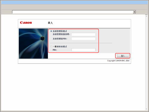 選擇[系統管理員模式]並輸入「系統管理員識別碼」/「系統管理員PIN」,然後按一下[登入]登入「遠端使用者介面」或MEAP應用程式(包含登入應用程式)。