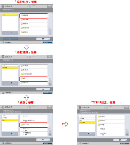 並使用觸控面板顯示螢幕以管理員身分登入,為本機器指定網路設定。有關管理員類型的資訊,請參閱"管理員設定."根據網路環境,在[參數選擇]的[網路]中指定設定。以下螢幕快照說明指定網路設定的操作流程。