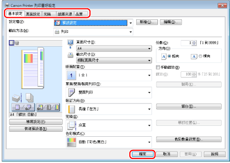 在印表機驅動程式螢幕中指定所需的設定→按一下[確定]。