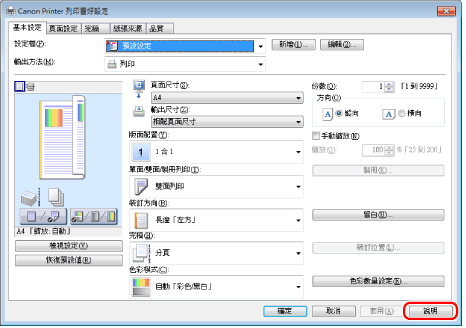 按一下印表機驅動程式畫面上的[說明],即可顯示說明。