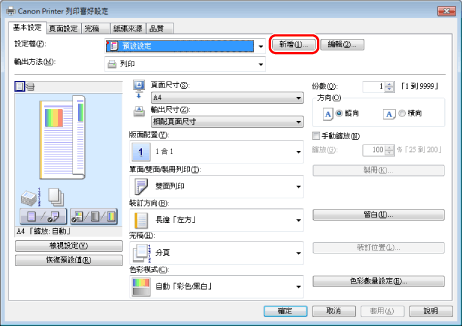 要編輯或刪除設定檔,在印表機驅動程式螢幕中,按一下[設定檔]右側的[編輯]。但是,無法修改預定義的設定檔。