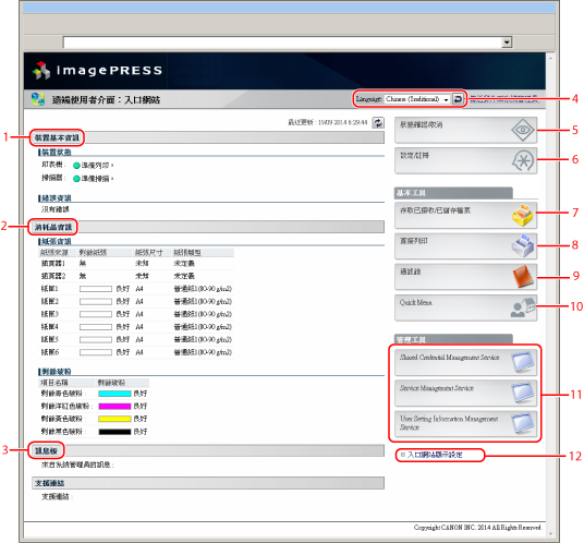 不管本機器觸控面板顯示螢幕上使用的是哪種語言,透過在入口網站頁面上選擇所需語言,可以變更螢幕上的顯示語言。