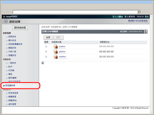 →[設定接收者]→[註冊LDAP伺服器]從本機器的控制面板指定LDAP伺服器設定。有關使用控制面板指定LDAP設定的說明,請參閱"LDAP伺服器設定."要指定LDAP伺服器設定,必須以管理員身分登入。