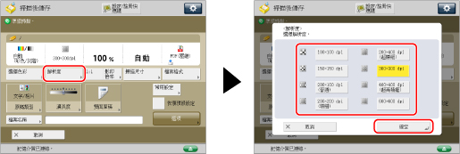 可以指定用於掃描原稿的解析度。以高品質掃描會增加檔案大小,但可以確保在最終影像中保留詳細的細節。