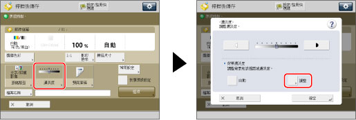 若透過按<背景濃淡度>的[調整]調整背景濃淡度,則會取消[自動]設定。同樣,若在[調整]中進行手動調整時按[自動],則會取消所作的調整。本機器自動調整濃淡度以與背景一致。