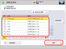 若要傳送工作完成通知,需要預先將電子郵件位址儲存在「本機通訊錄」或單鍵按鈕中。