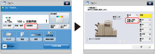 用紙の種類は必ず正しく設定してください。特に厚紙など、特別な種類の用紙にコピーするときは正しく設定されていないと画像不良が起こる可能性があり、定着器が汚れたり紙の巻きつきが発生したりして、担当サービスによる修理が必要になることもあります。